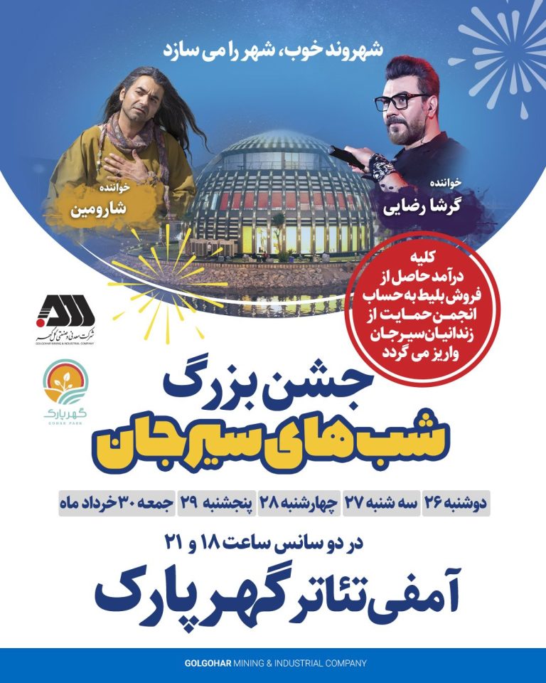 برگزاری جشن های بزرگ شب های سیرجان با حضور هنرمندان مطرح کشوری از تاریخ ۲۶ الی ۳۰ خرداد ماه در دو سانس ساعت ۱۸ و ۲۱ محل برگزاری: آمفی تئاتر گهر پارک سیرجان *روابط عمومی شرکت معدنی و صنعتی گل گهر